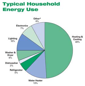 As shown on the pie chart, heating and cooling account for almost 50 percent of the typical American home´s annual energy consumption. Because heating and cooling take such a big bite out of the energy pie, if you´re serious about conservation and efficiency, you´ll start by improving your home´s insulation and reducing air infiltration.